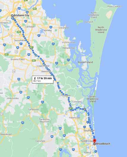 All my life I thought it was about a 100k drive down to the Gold Coast, but not according to my old friend Google Maps, which tells me that my walk on friday will be 85km or so.