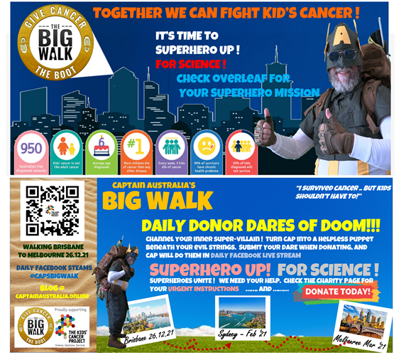I didn’t go out dressed as the boofhead superhero Captain Australia today. No donations or DAILY DONOR DARES OF DOOM, so I spent the day slaving over a hot computer instead. I’m not a graphic designer at all, but I think I did an .. okay .. job at these flyers and posters which I’ll use to promote the walk. What do you reckon ?