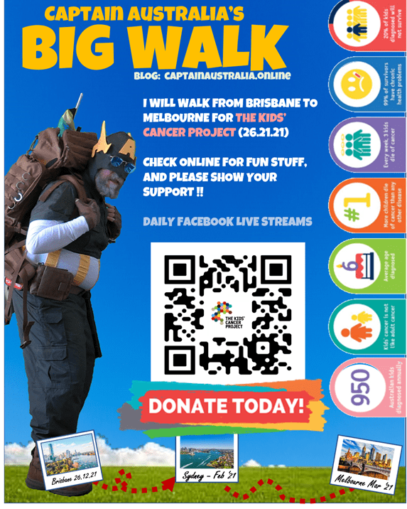 The transcendent Hoodoo Gurus gave permission to use their wonderful song 1000 miles away in connection with THE BIG WALK for THE KIDS’ CANCER PROJECT. So watch Captain Australia groove out while sharing the facts about paediatric cancer.
