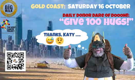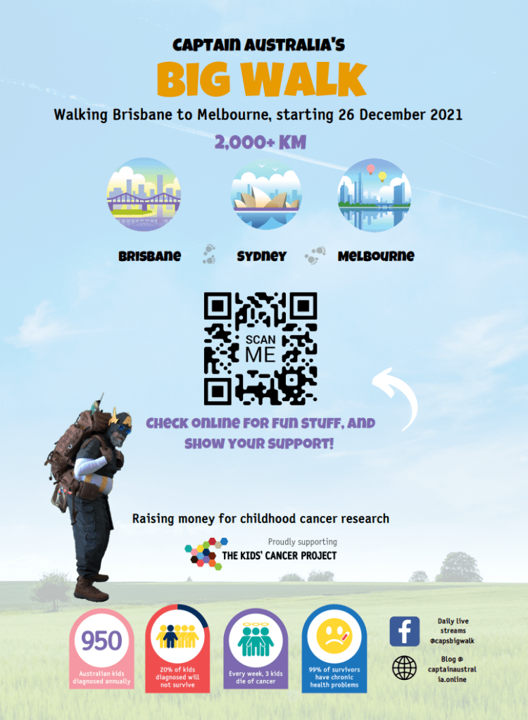 It’s been suggested I need to figure out cryptocurrency and receive donations in that format – but I just can’t wrap my head around that, or how I’d manage the process of collection, conversion and passing to The Kids’ Cancer Project (they don’t touch it). When I started out, I figured it could all be online and I wouldn’t have to worry about anything but the walking.