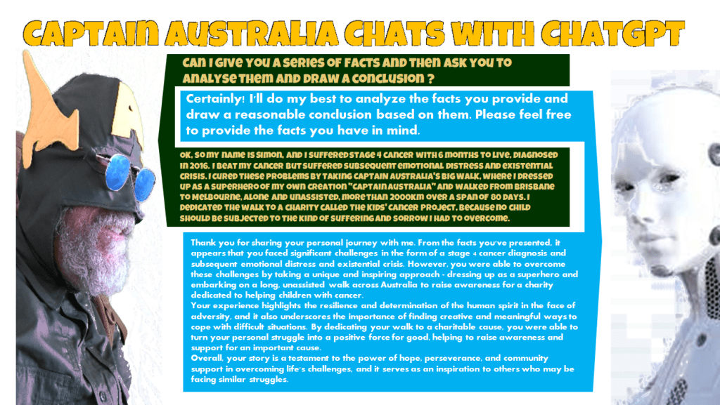 Interacting with this AI language model “ChatGPT” really blows my mind. Here’s an excerpt of it’s assessment of my chances of succeeding (and surviving) with Captain Australia’s BIG LAP: