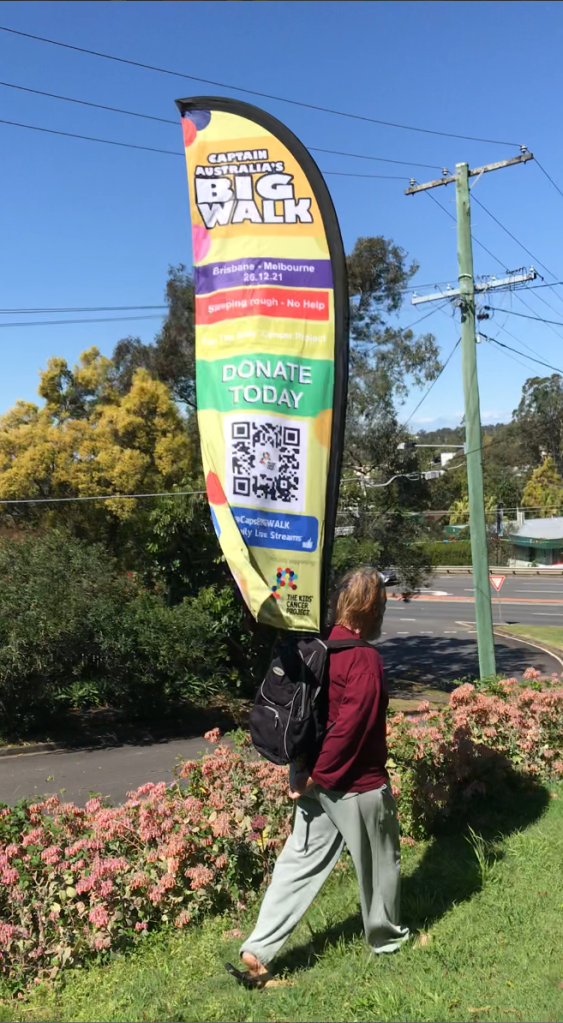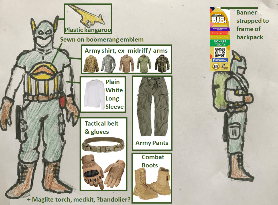 I realised I needed to bring Captain Australia back. I decided to do a BIG WALK for The Kids’ Cancer Project, where on 26.12.21 I will walk from Brisbane to Melbourne, by myself, no help, sleeping rough, dressed as the boofhead superhero Captain Australia.
