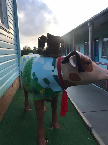 It was a cold, misty morning, my boots were still very soggy, so I set them on the back of this painted cow statue, and ate a protein bar.