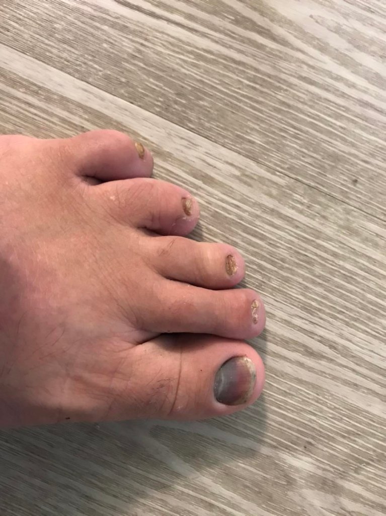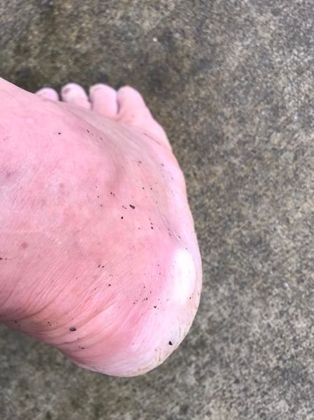 When I set out, my feet were already damaged, here’s some pictures taken throughout the day – you’ll note the blisters and peeling skin, and the big, firm blister forming on my heel. (Sorry it’s gross)