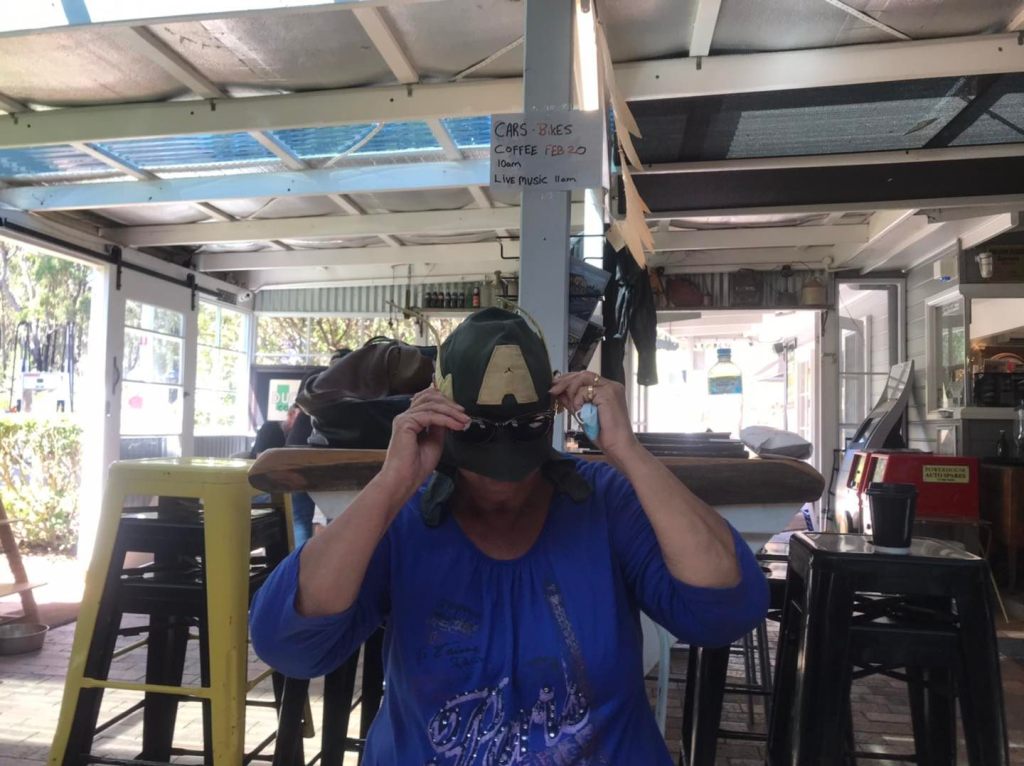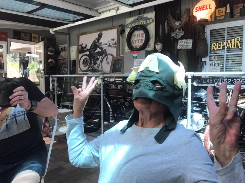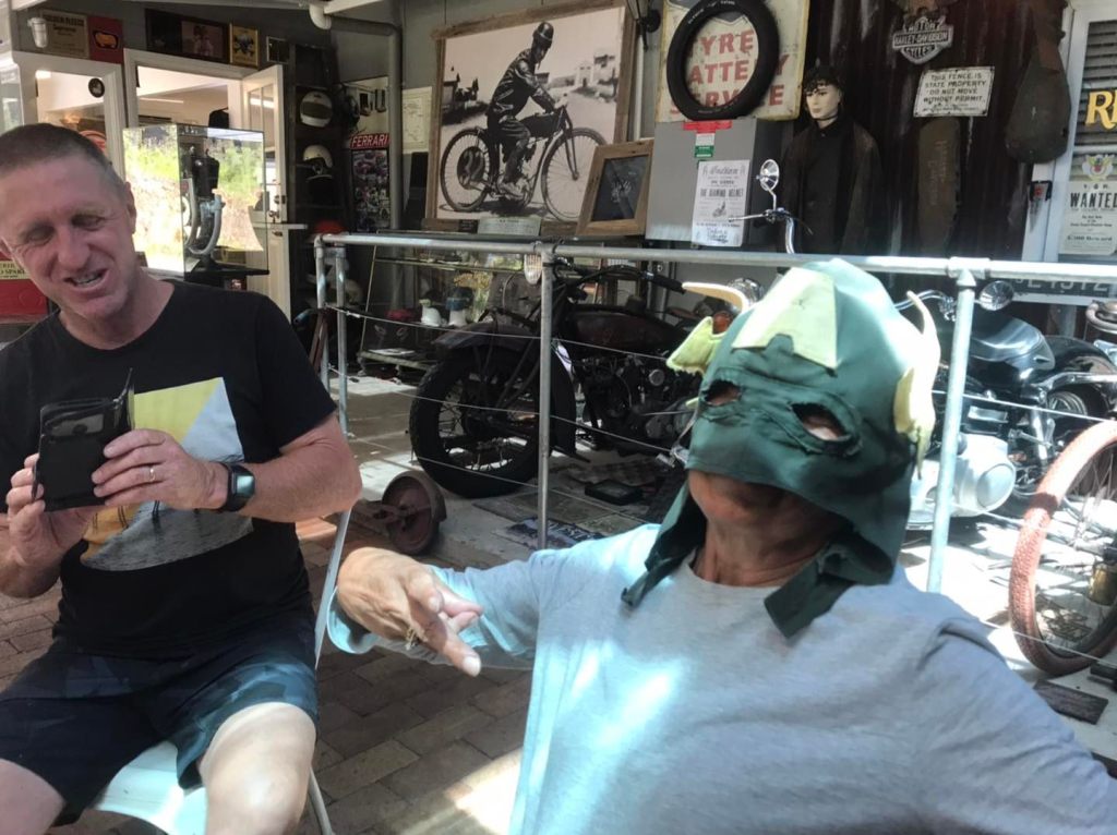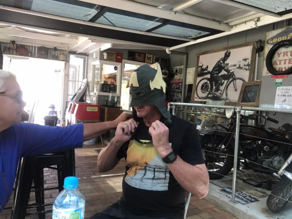 Locals, staff, bikies, travellers – and as I toddled in, like the worlds’ biggest oldest super-hero dressed kid ….