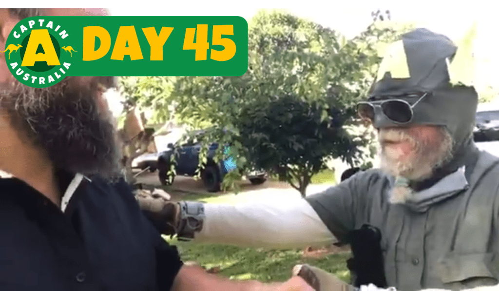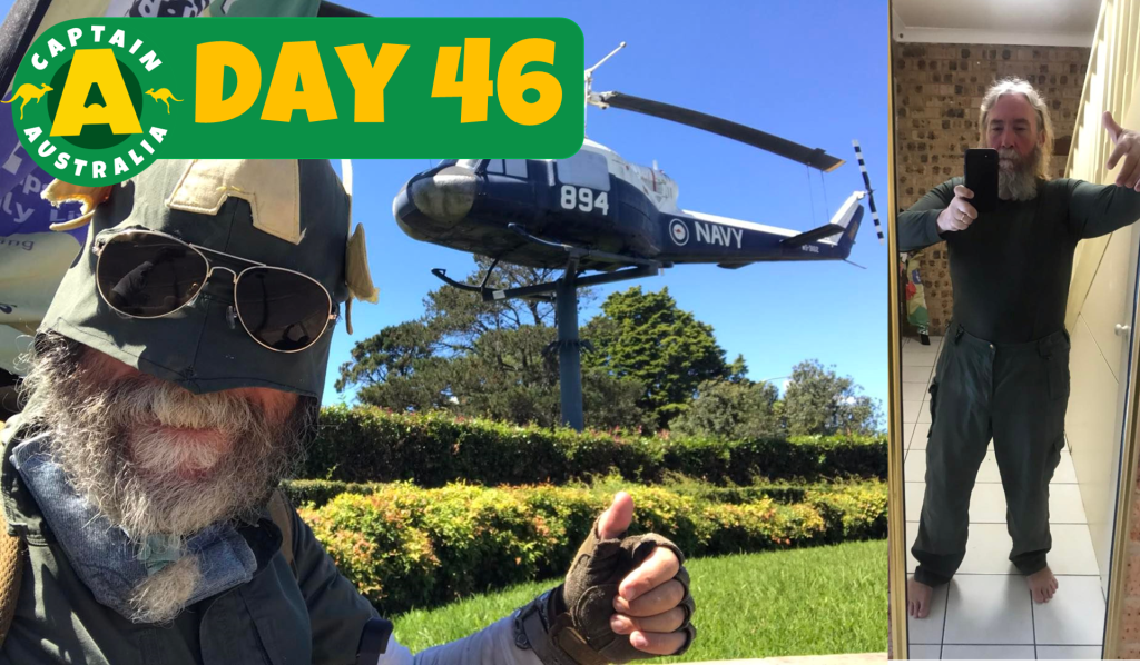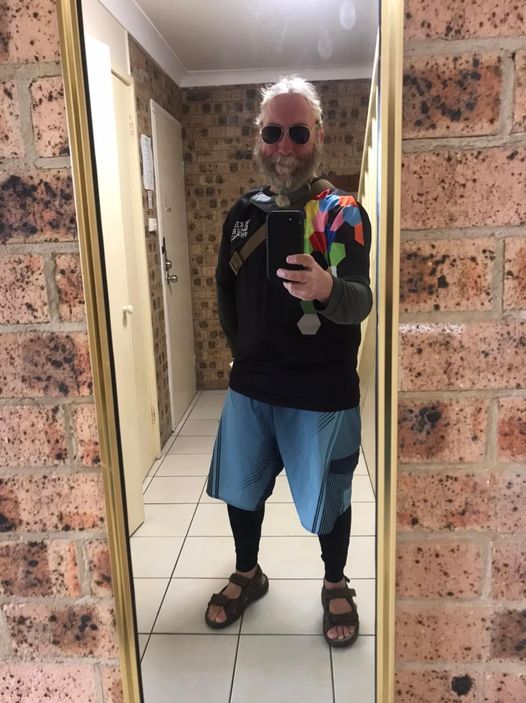 This is how I looked as I wandered about town – I didn’t carry much clothing except for the Captain Australia gear, so I had my thermals, sandals, a “The Kids’ Cancer Project’ t-shirt, and some boardshorts given to me by this lovely bloke Steve on the side of the road in Sydney (somewhere around Mona Vale if I remember right).