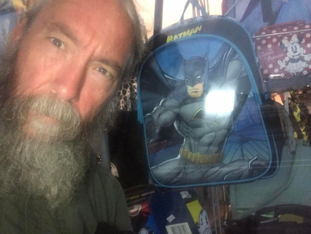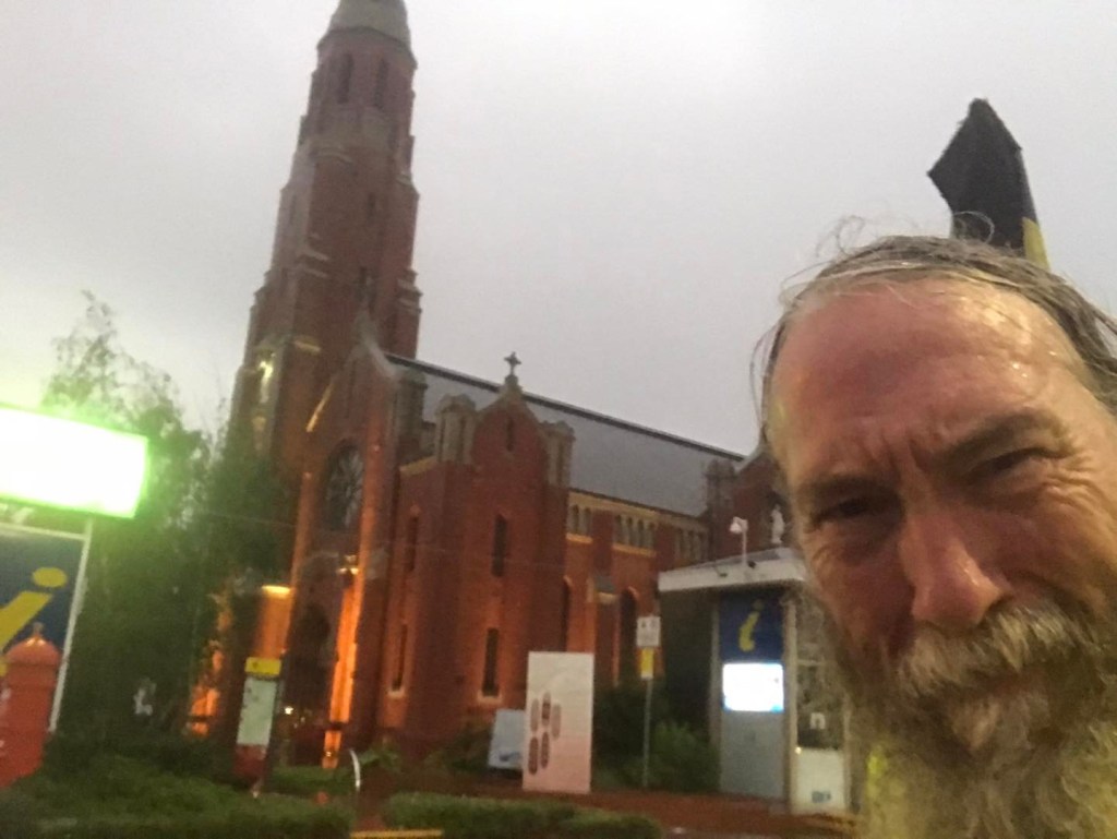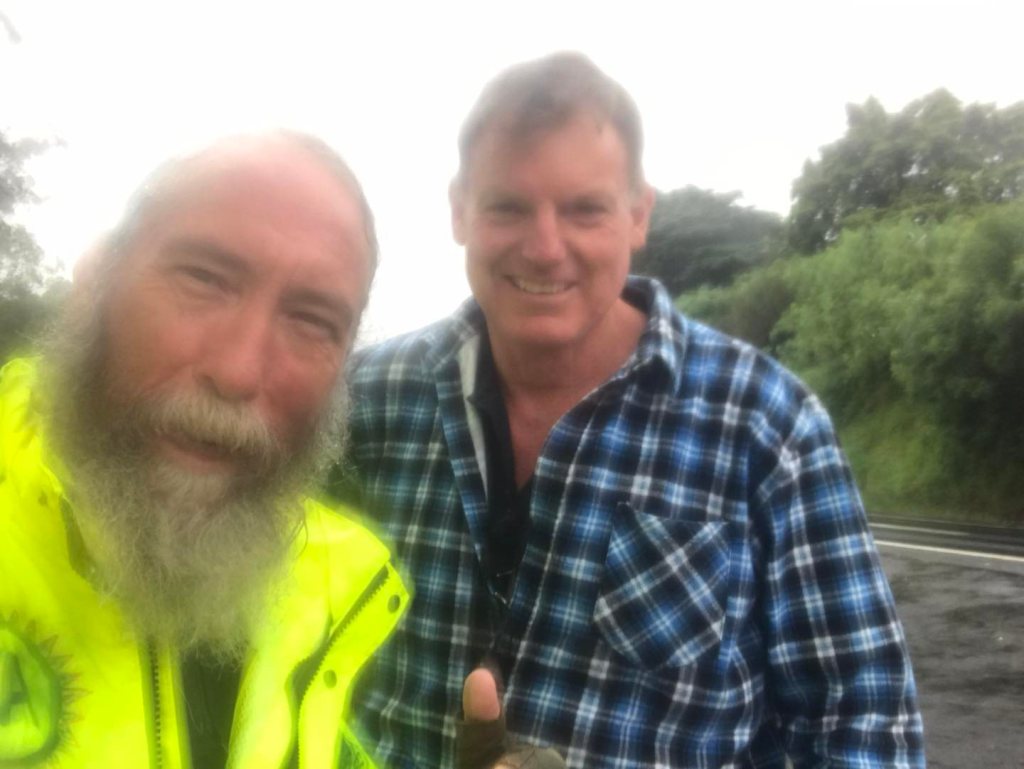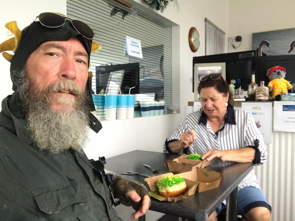They gave me an extra donut for Wendy, and our bold hero Captain Australia skipped his way back through the driving rain to the motel to pack and say goodbye (over a donut).