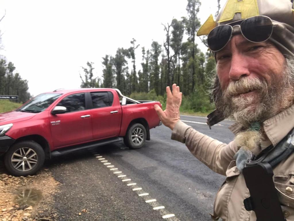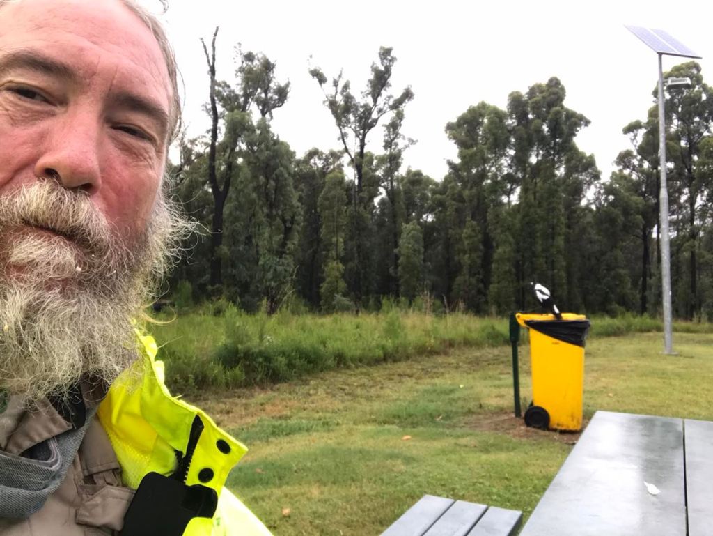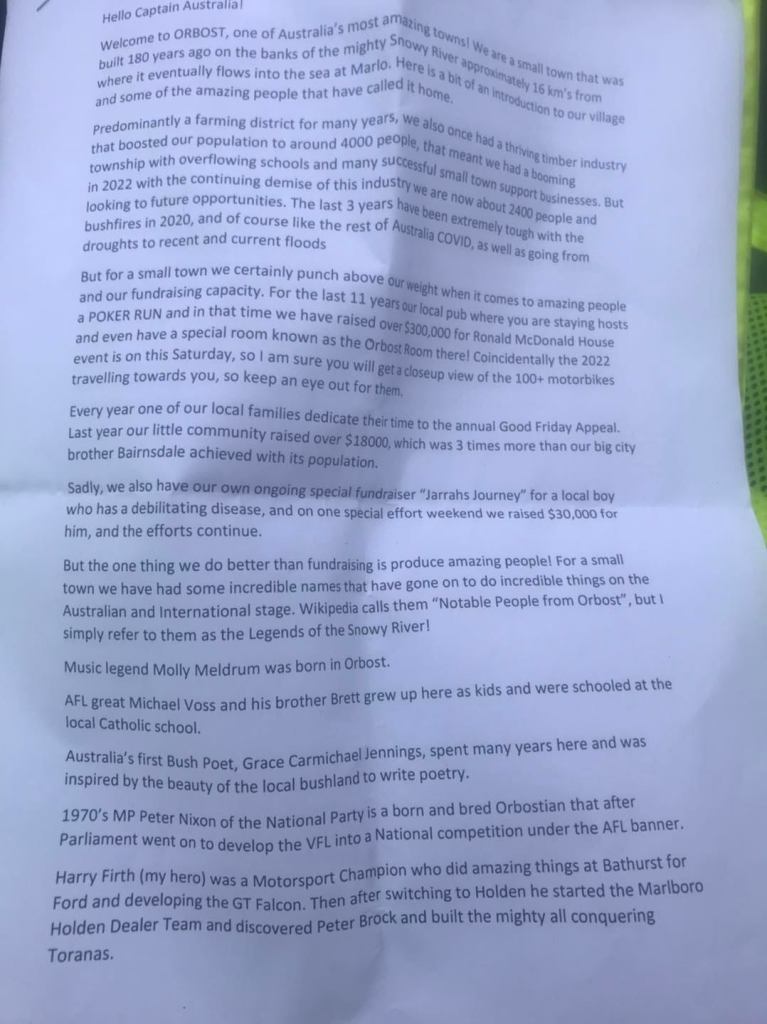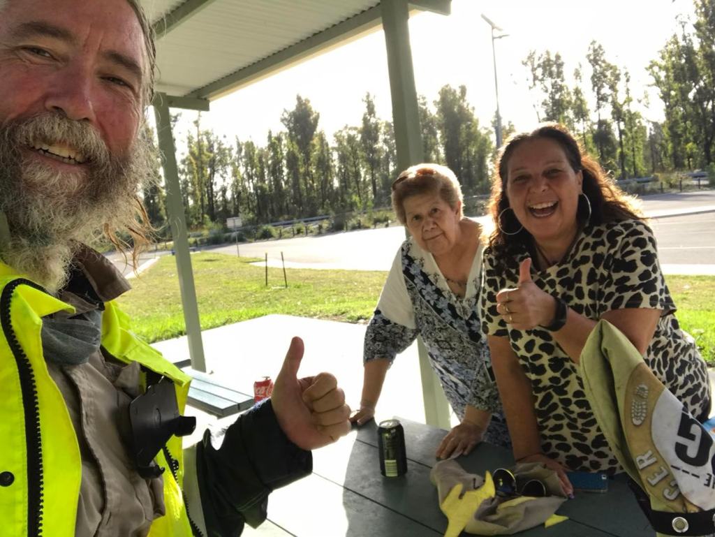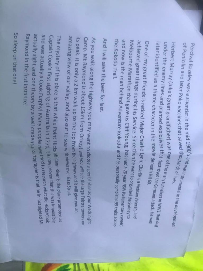 Peter from Orbost was waiting for me at a rest area. What a lovely lovely man. He’d prepared for me an essay with a lot of local history, and brought me a little bit of breakfast. We had a friendly (and often funny) chat, and he hinted that he was trying to pull together some kind of reception for when I got to Orbost.