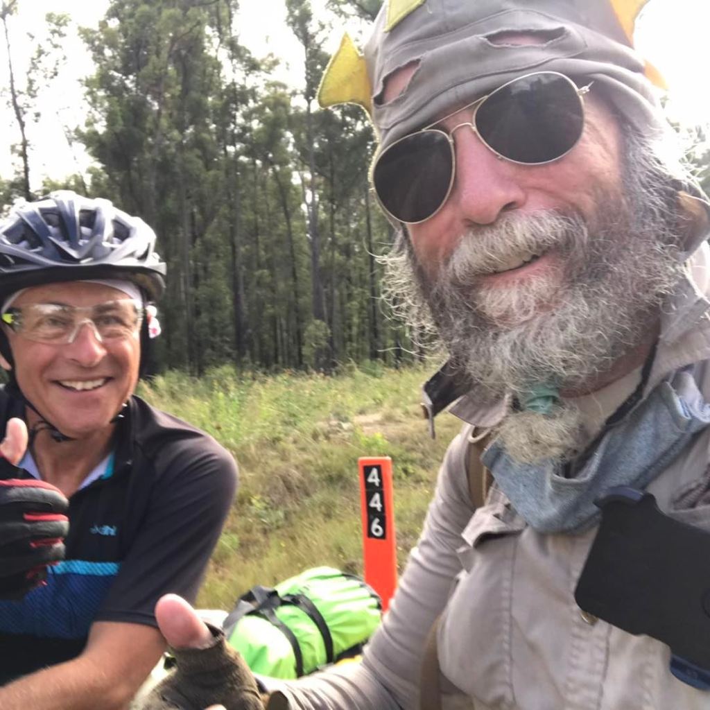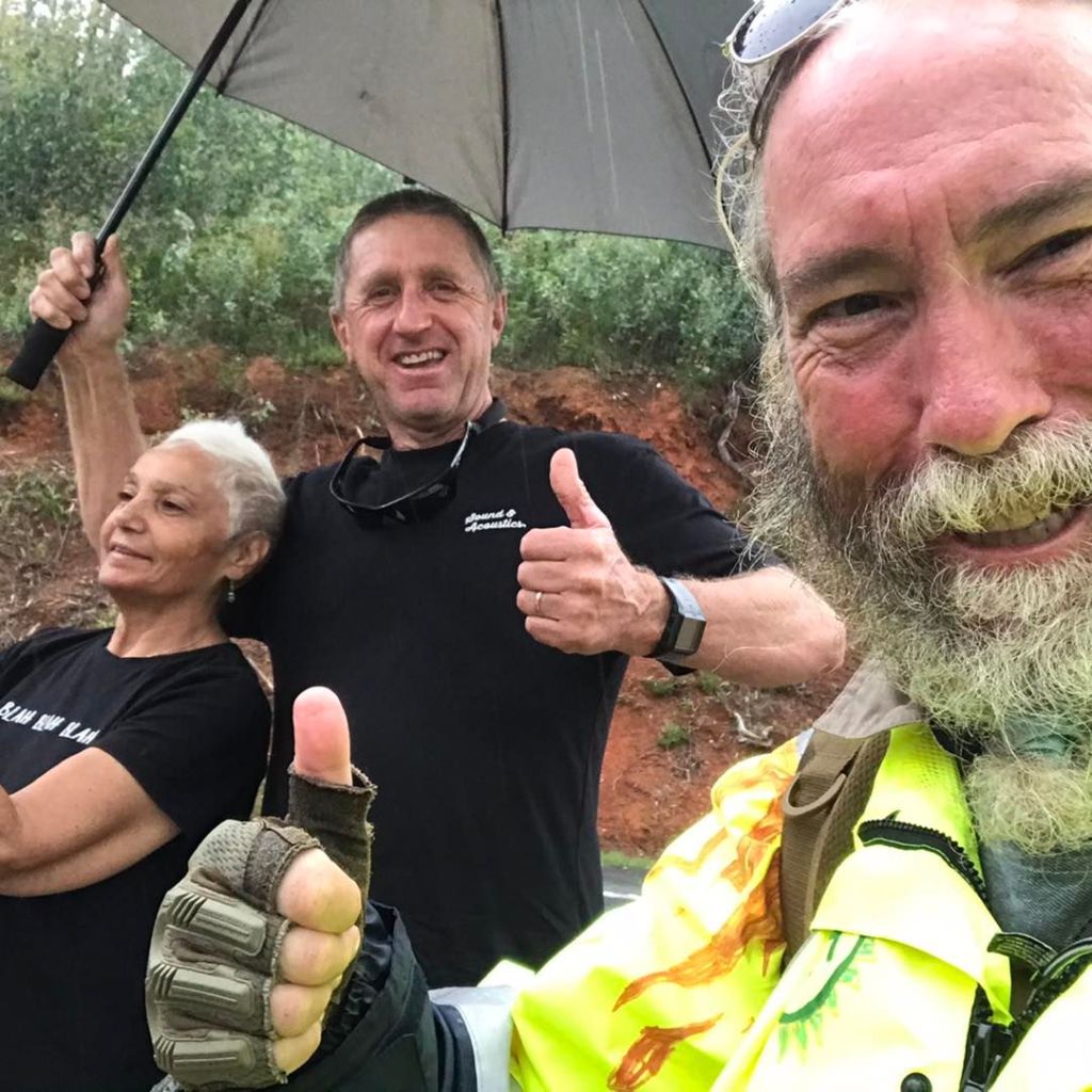 I’d given up on finding a dry place to rest, and was having a lay down in light rain to rest the old legs and back, when whaddayaknow, my old mates Andy and Mez turn up.