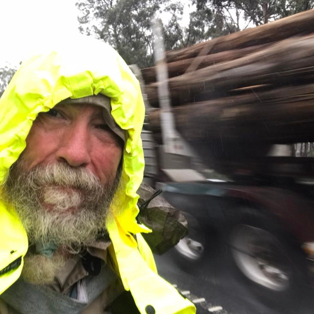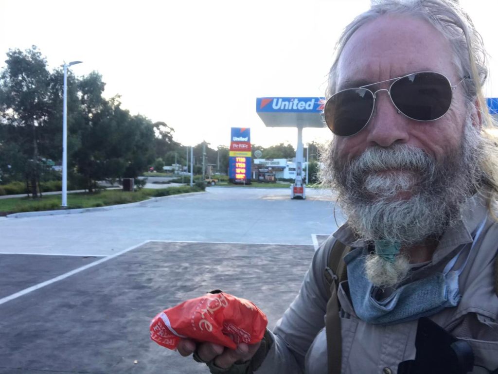I bought a hot breakfast (meat pie) from the servo across the road, and headed out of town, stopping by a fallen log near a caravan park on the outskirts to eat and do one of my live-stream updates.