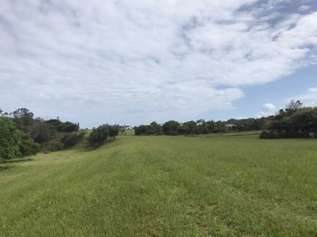 I was at Red Head / Black Head, and there didn’t appear to be any way around following the cliffs & beach, so diverting inland and crossing through a patch of trees, I came to a fence and a long sweeping hill.