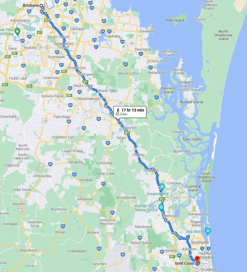 I figure on a possible short sleep around Dreamworld. My default plan will be 15km walk, 30-60 minute break, 5 intervals of that spread over the next 24 hours. I probably will not sleep and push through, arriving in the GC in mid morning Monday 27th December.
