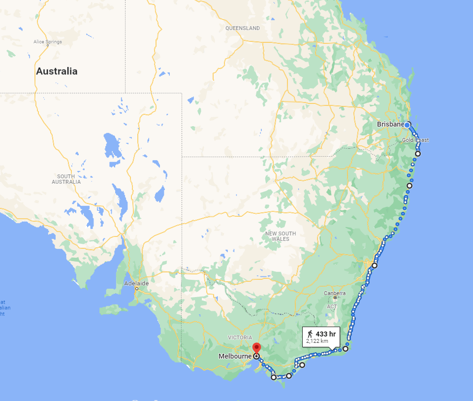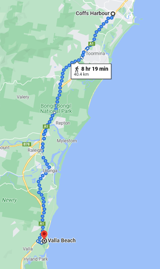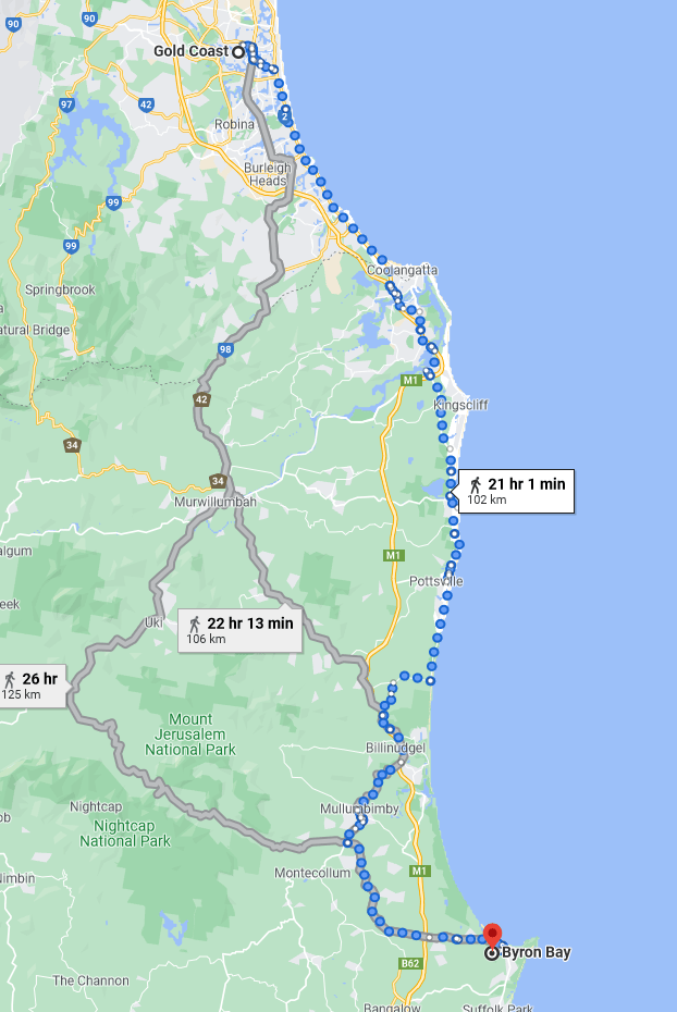 So I’ll leave Byron Bay, and I have myself doing that on 30 December, but I have to wonder if that’s not a bit crazy. Yes, it’s doable, but it’s a lot of aggressive walking – no stopping to smell the coffee .. or the roses .. or the ocean, if you prefer.