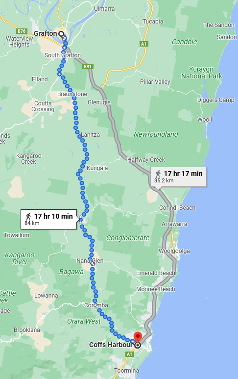 Following Day (1 January) head to a small corner of road called Whiporie – about 50km through forest and national parkland, it should be lovely. Sleep somewhere thereabouts, and continue down to Grafton on January 2, sleeping outside the city somewhere (after another 50km hike).