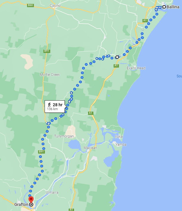 If I weren’t doing this as “Captain Australia’s BIG WALK” (For The Kids’ Cancer Project) and it were just me, not sharing it, doing my own thing quietly – this would be a turning point, because after Grafton I’d be sorely tempted to turn inland and take in a more rural, country, bush-town route through much of New South Wales. Pass through Tamworth, visit some beautiful (and no doubt friendly, even to a boofhead like me) inland towns.