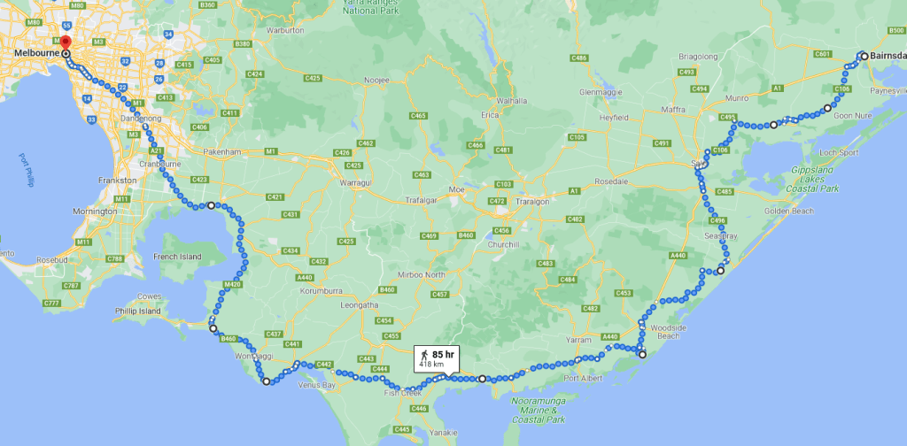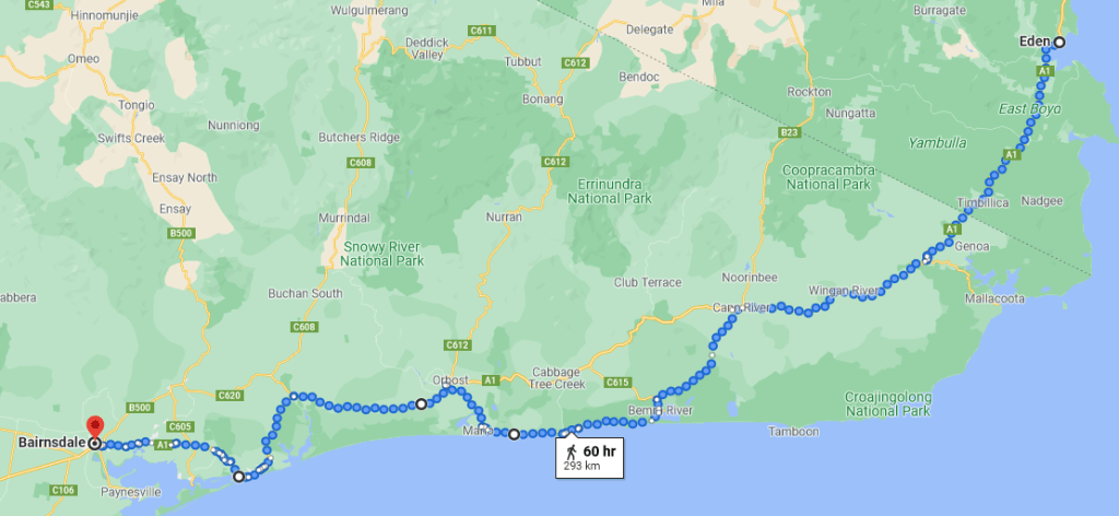 Roughly, we’ve got 300km for this leg, taking that on the basis of 40km per day, then we’re looking at about 8 days, getting from Eden to Bairnsdale, let’s say leaving Barnsdale on 16 Feb for the final leg into Melbourne.