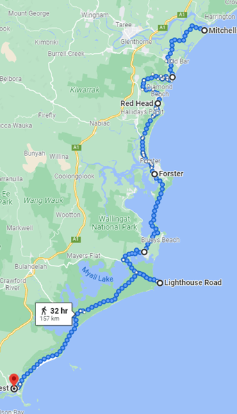 I might take it easy for a couple of days here – set a goal of about 35km per day. The next 2 days are ambling through beach towns and roads until I hit Harrington and an obstacle in the Manning River (which I’m hoping I can ask a local boat to help me across, otherwise it’s a big diversion and a stretch along the Pacific Highway. Have to play this bit by ear, but lets say I arrive Harrington on the afternoon of 13 January.