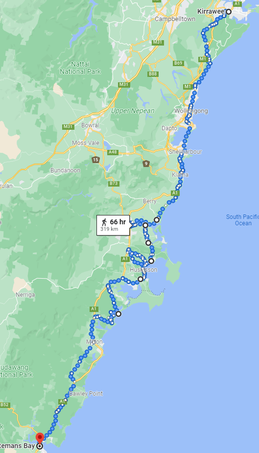 I want to avoid the Princess Highway / any highway, as much as possible. Problem is there’s no guarantee of secondary roads alongside it, so much of the walk will follow the coastline wherever possible.