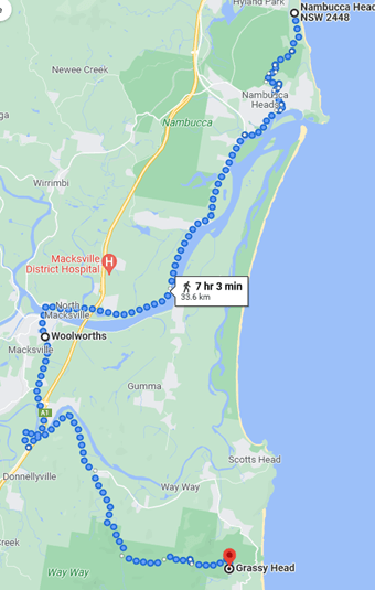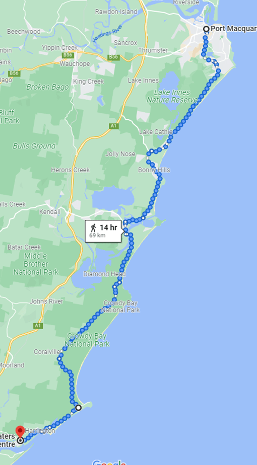 Google Maps wants me to walk down the Pacific Highway, which would be unsound, unsafe and inconsistent with my goals. So let’s say I spend the morning of 11 January hanging around Port Macquarie and set out after lunch, following beach and coastal roads.